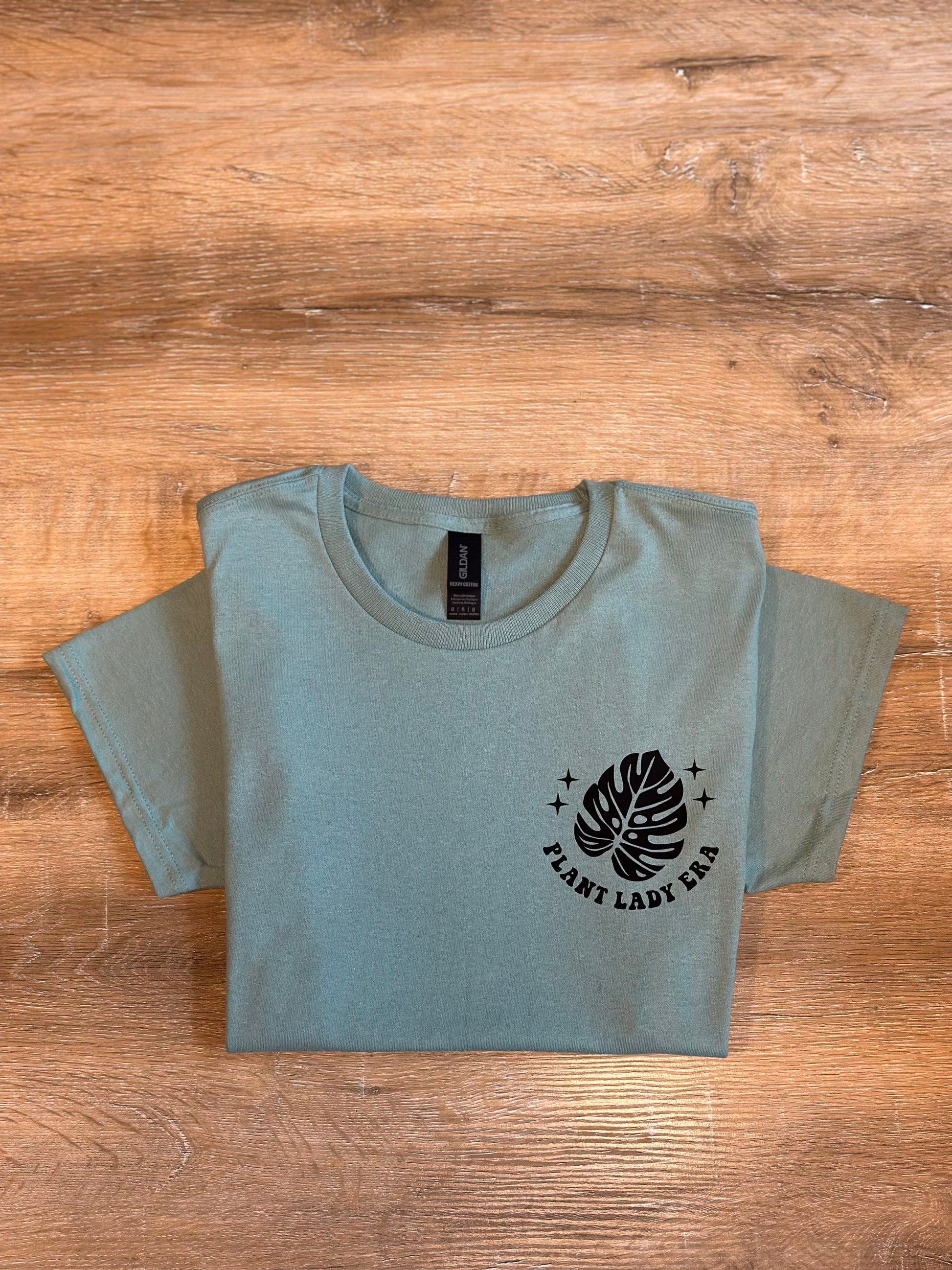 Ladies, raising plants is a full time job and very rewarding!! These plants become our babies!! Garden love!! Small left pocket design with a leaf and says Plant Lady Era, back middle design says In My Plant Lady Era bolded with little embellishments surrounding it. Material: Black heat transfer vinyl.