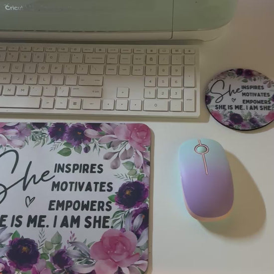 This mouse pad design features bold colors and sleek graphics/text that inspires! “SHE motivates, inspires & empowers”, makes the perfect accessory to add a touch of personality to your workspace. Great for gamers, designers, students, industry leaders and anyone looking to spice up their desk! Bonus included matching coaster to keep your beverage stable & desk free of drinks stains!