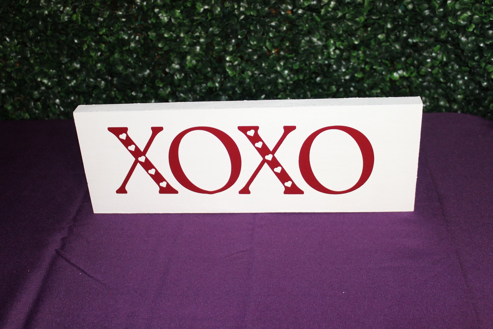 Wood sign measuring 14”x5” hand painted layered with permanent vinyl with heart cutouts through each letter X. Love is in the air!! Perfect for office space, kitchen or living room space.